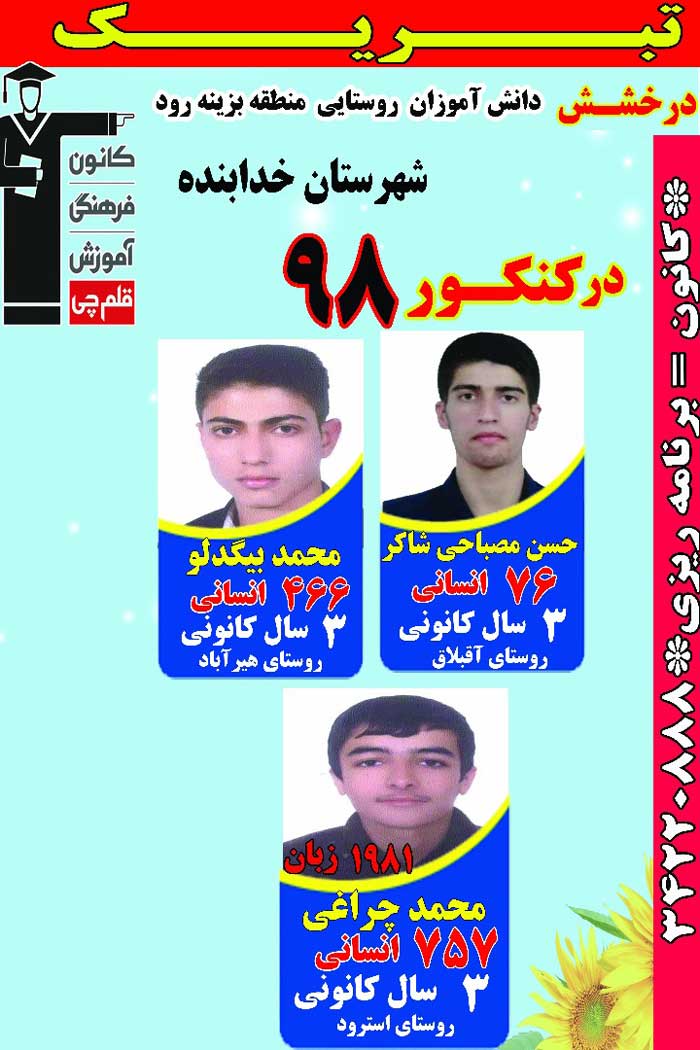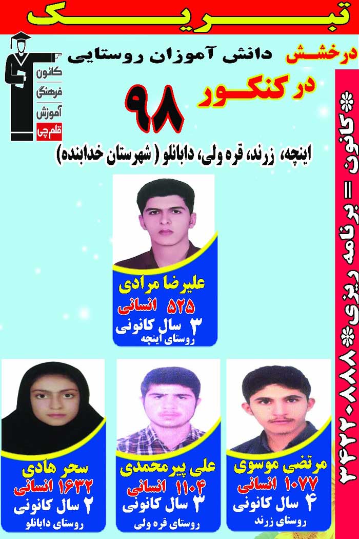 درخشش دانش آموزان روستایی خدابنده در کنکور 98 را در زیر مشاهده می کنید