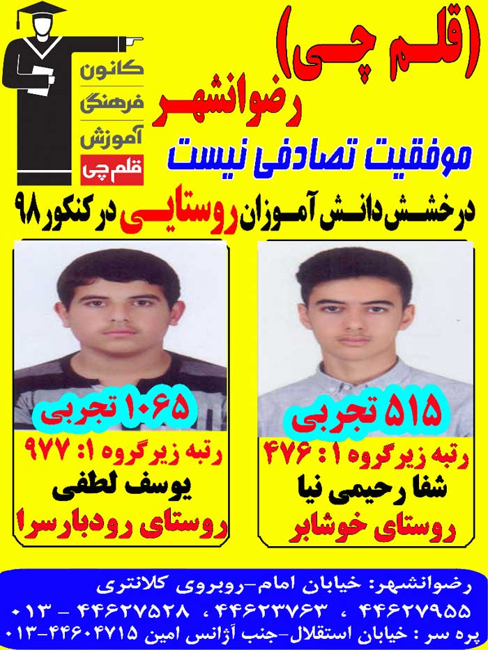 درخشش دانش آموزان روستایی رضوانشهر در کنکور 98 را در زیر مشاهده می کنید