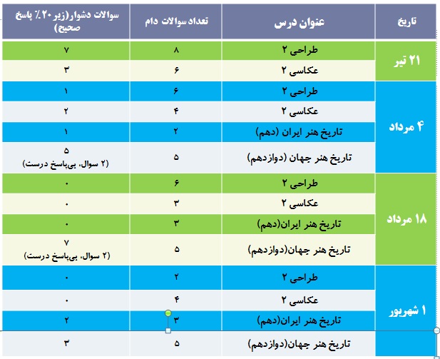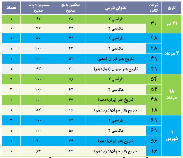 همانطور که مشاهده میکنید، در سه آزمون اول پروژه تابستان به طور کلی در دو درس طراحی 2 و عکاسی 2 که درسهای پایة یازدهم (سال گذشته) بودهاند، در هر آزمون نسبت به آزمون قبل پیشرفت و حرکت روبه جلو دیده میشود و این روند در آزمون 1 شهریور متفاوت است و درصد کمی افت داشته است. درصد پاسخگویی صحیح به درس تاریخ هنر ایران که درس نگاه به گذشته (پایه دهم) است، در هر آزمون کاهش داشته و با پیشروی مباحث درصد کم تری از دانشآموزان توانستهاند به سوالات آن پاسخ درست بدهند.