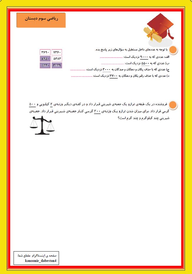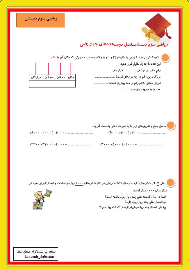 نمونه سوال ریاضی سوم دبستان_فصل دوم (عددهای چهاررقمی)