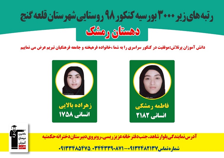درخشش دانش آموزان روستایی قلعه گنج در کنکور 98