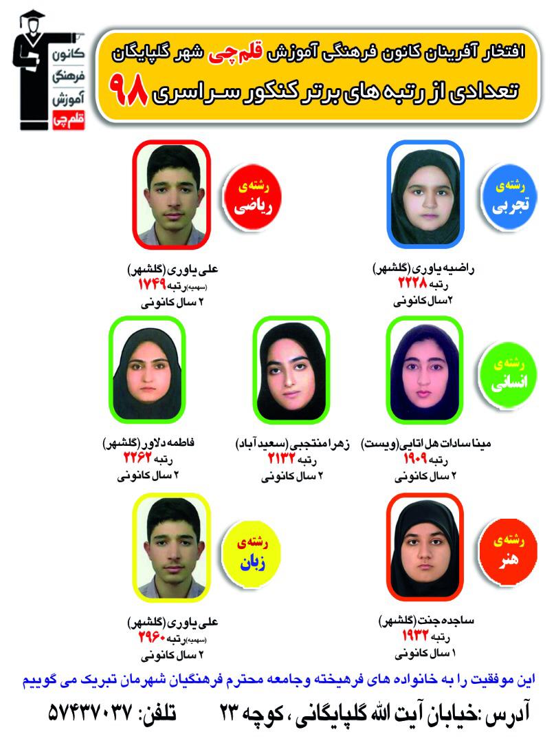 درخشش دانش آموزان روستایی گلپایگان در کنکور 98 را در زیر مشاهده کنید .
