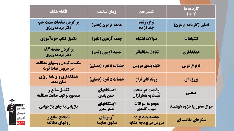 در کانون جلسات 5 نفره چندین بار برگزار می شود کارنامه 5 نوع درس زمینه ی شناخت را برای شما فراهم می کند و قدم اول شناخت طبقه بندی است که در این کارنامه انجام شده است. اقدامی که باید انجام دهید مکتوب کردن ساعت های مطالعه است که به شما کمک می کند روش های موفق مطالعه ی خودتان را استخراج کنید.