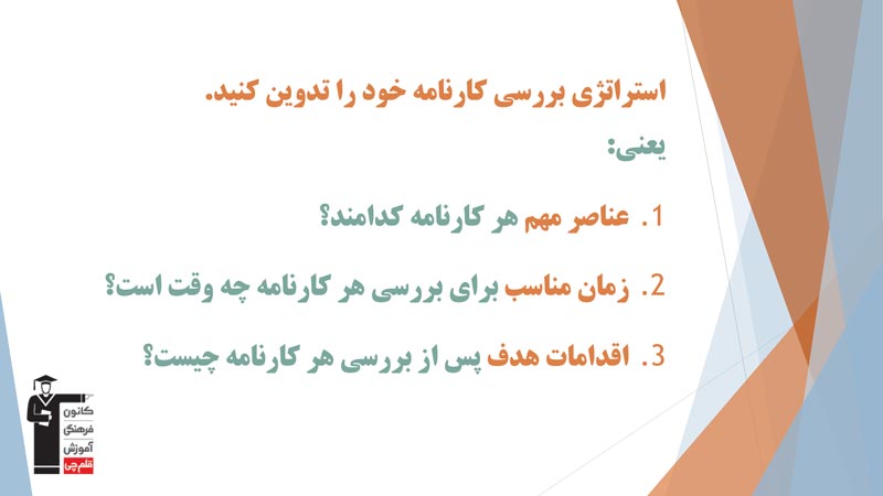 دیدگاه کانون این است که بازخورد دادن به خودی خود منجر به رشد و پیشرفت می شود. در کانون این بازخورد با ابزارهایی انجام شده و سپس به مجموعه ابزار تبدیل شده است. وقتی این بازخورد تبدیل به کارنامه شده است به شما کمک شایانی می کند تا رشد بیشتری داشته باشید. دانش آموزان کانونی 7 + 1 کارنامه دارند. هر کارنامه در یک بازه ی زمانی بیشترین کاربرد را دارد. لازم است که برای بررسی کارنامه ی خود استراتژی تدوین کنید. باید عناصر هر کارنامه را بشناسید زمان مناسب هر کارنامه را باید بدانید و به موقع از آن استفاده کنید. سپس باید اقداماتی نسبت به بازخوردی که گرفتید انجام دهید.