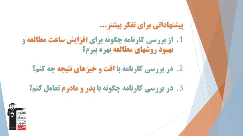 پیش خودتان بگویید من چگونه می توانم از کارنامه ها برای افزایش ساعت مطالعه ام استفاده کنم و برای بهبود روش های مطالعه ام. یک سری افت و خیر دارید و این طبیعی است و به این فکر کنید چگونه با افت و خیزهایتان کنار بیایید و چگونه هیجانات خود را در مواجه با این کارنامه ها کنترل کنید. پدر و مادر ها هم بخشی از مشکل نیستند بلکه بخشی از راه حل هستند.