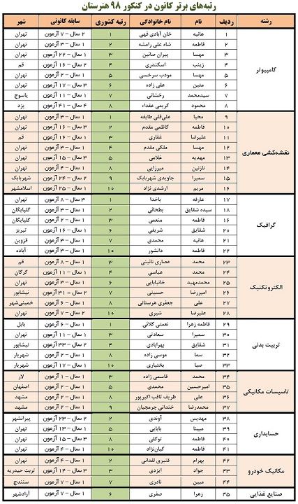فهرست زیر، رتبههای برتر کانون قلمچی در کنکور 98 هنرستان و تعداد حضور در آزمونهای برنامهای کانون را معرفی میکند.