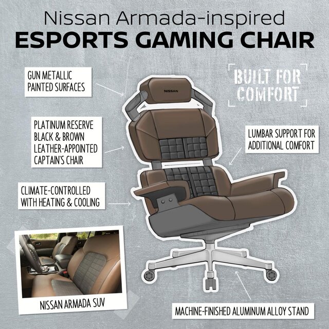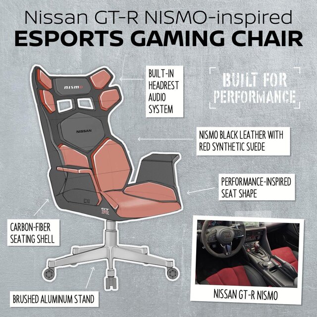یک صندلی، "جیتی-آر نیسمو"(GT-R Nismo) نام دارد و یک صندلی مسابقه است که از ورقه نازک فیبر ساخته شده و سیستم صوتی آن در یک هدست تعبیه شده است.