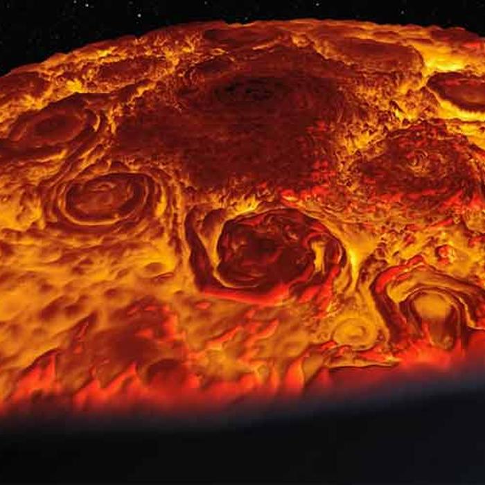 اخترشناسان با استفاده از تلسکوپ فضایی اسپیتزر متوجه ابرهای طوفانی بزرگی در سیاره مشتری شده اند؛ ابرها داغ تر از آن هستند که حاوی آب باشند، به نظر می رسد که این ابرها از شن و آهن مذاب باشند، برق های مشتری صدها برابر روشن تر از برق هایی است که در زمین رخ میدهد.