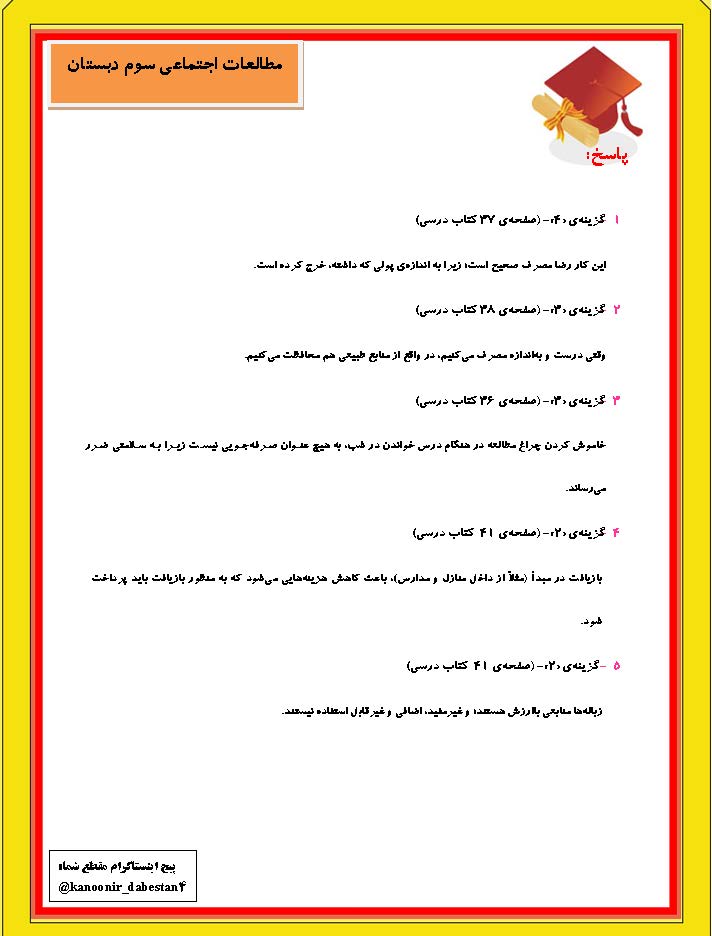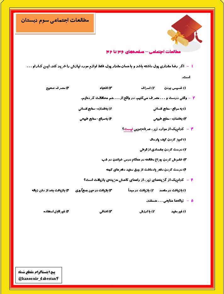 نمونه سوال تستی درس مطالعات اجتماعی سوم دبستان صفحات 36 تا 42 + پاسخ