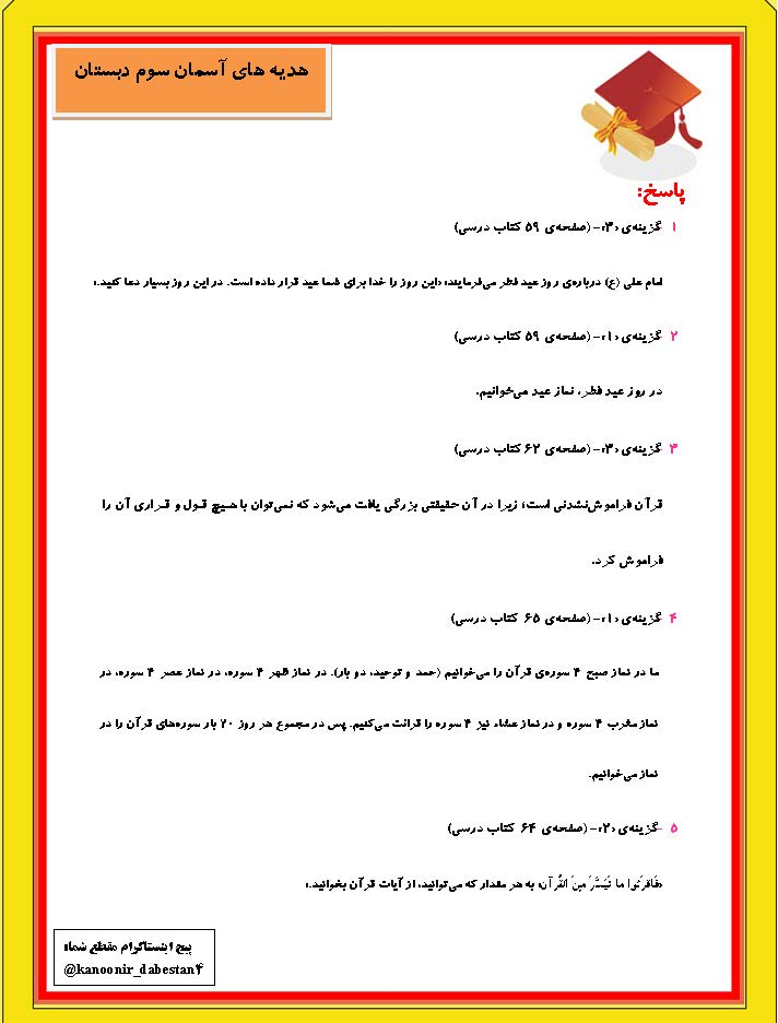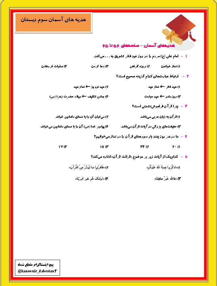 نمونه سوال تستی درس هدیه های آسمان سوم دبستان صفحات 56 تا 65 + پاسخ