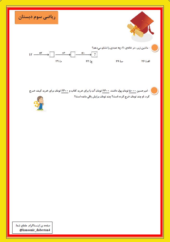عکس هایی که در ادامه قرار گرفته است،نمونه سوالات درس ریاضی سوم دبستان میباشد که توسط فاطمه احدزاده دانشجوی رشتهی مهندسی پلیمر دانشگاه تهران تهیه شده است.
