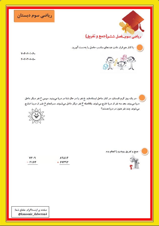 نمونه سوالات ریاضی سوم دبستان_فصل ششم(جمع و تفریق)