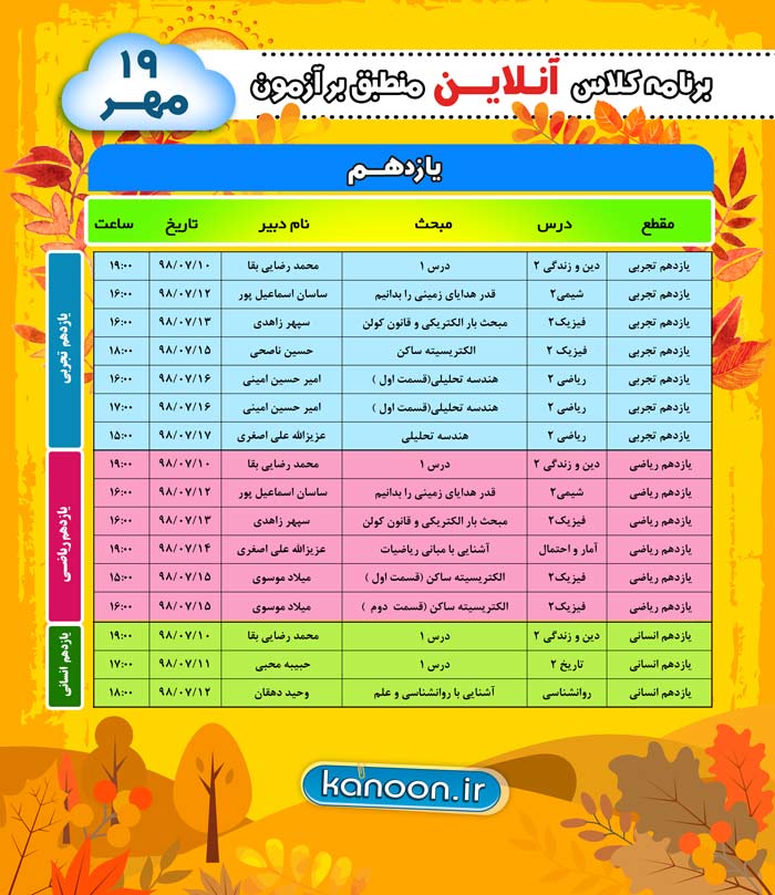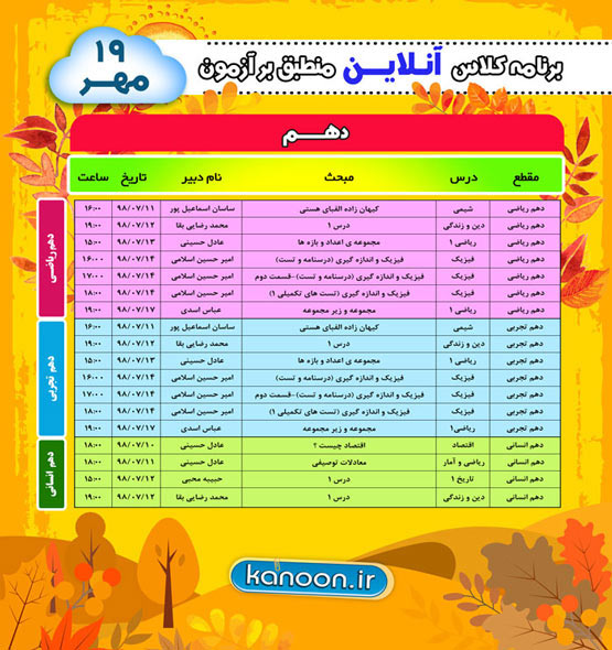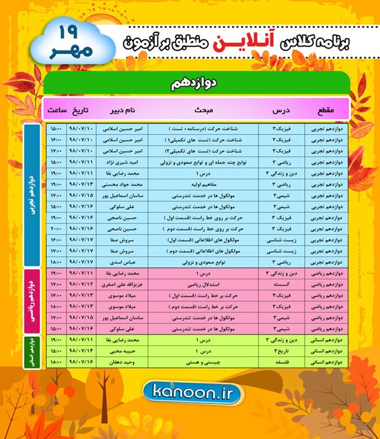 برنامه برگزاری کلاس های درسی آنلاین منطبق بر آزمون 19 مهر را در ادامه می توانید مشاهده نمایید: برای مشاهده برنامه کلاس های آنلاین کلیک کنید .برای مشاهده باز پخش کلاس های آنلاین کلیک کنید .