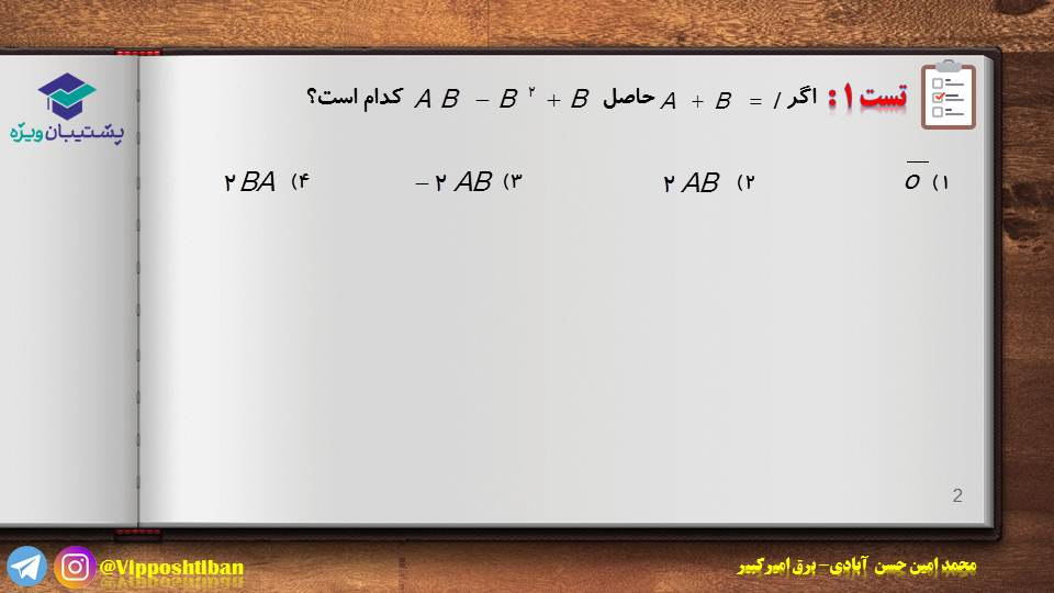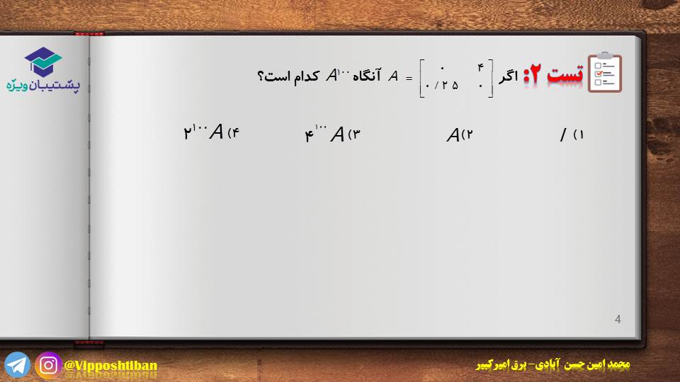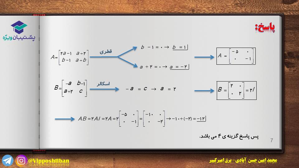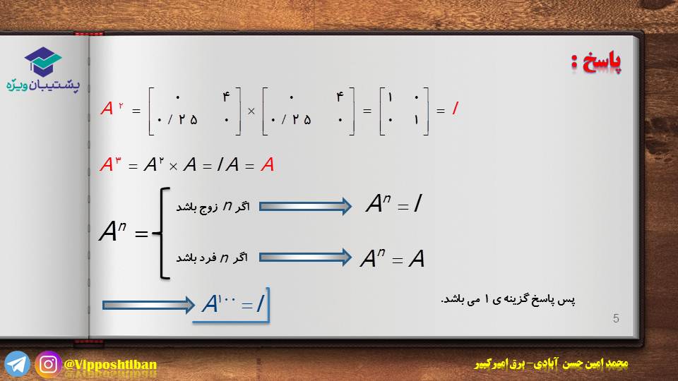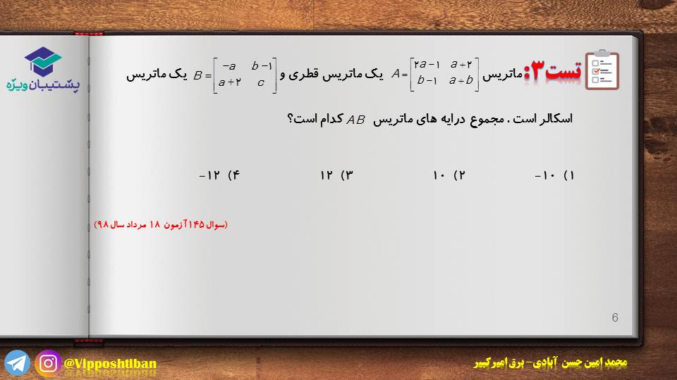 تست های مهم و پر تکرار مبحث ماتریس که هماهنگ با آزمون 19 مهر 98 می باشد در اسلاید های زیر قرار گرفته است.برای استفاده از دیگر جزوه های رایگان ما و همچنین ویس آموزشی مربوط به این جزوه به کانال vipposhtiban مراجعه نمایید.