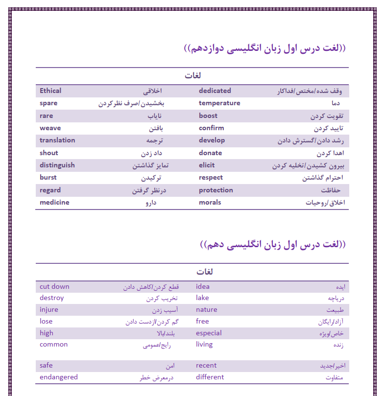 لغات مهم درس اول زبان انگلیسی دهم و دوازدهم