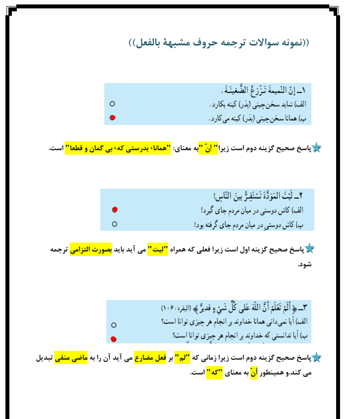 نمونه سوالات ترجمه حروف مشبهة بالفعل