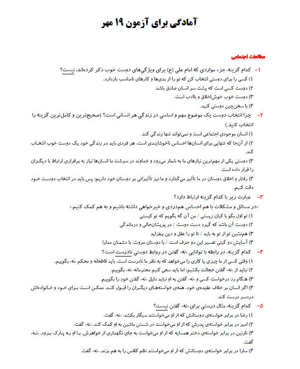 در زیر نمونه سوالهایی از درس مطالعات اجتماعی برای شما آورده شده است. سوالها را به دقت بخوانید و آن ها را پاسخ دهید. سپس پاسخ خود را با پاسخ تشریحی که در ادامه فایل آن را بهصورت پی دی اف برای شما آوردهایم مقایسه کنید. مباحث این سوالات منطبق با آزمون 19 مهر است.