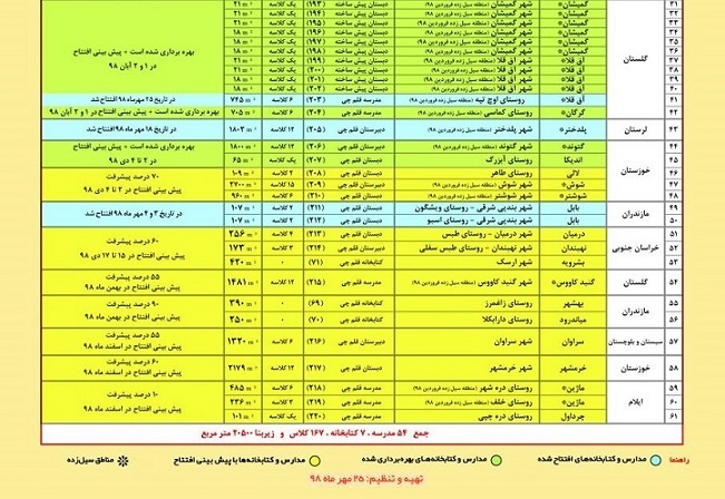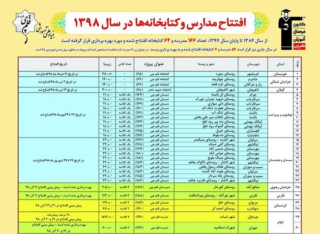 جدول پروژه های افتتاح شده و در حال اجرا (ساخت مدارس و کتابخانه ها) بنیاد قلم چی در سال 1398
