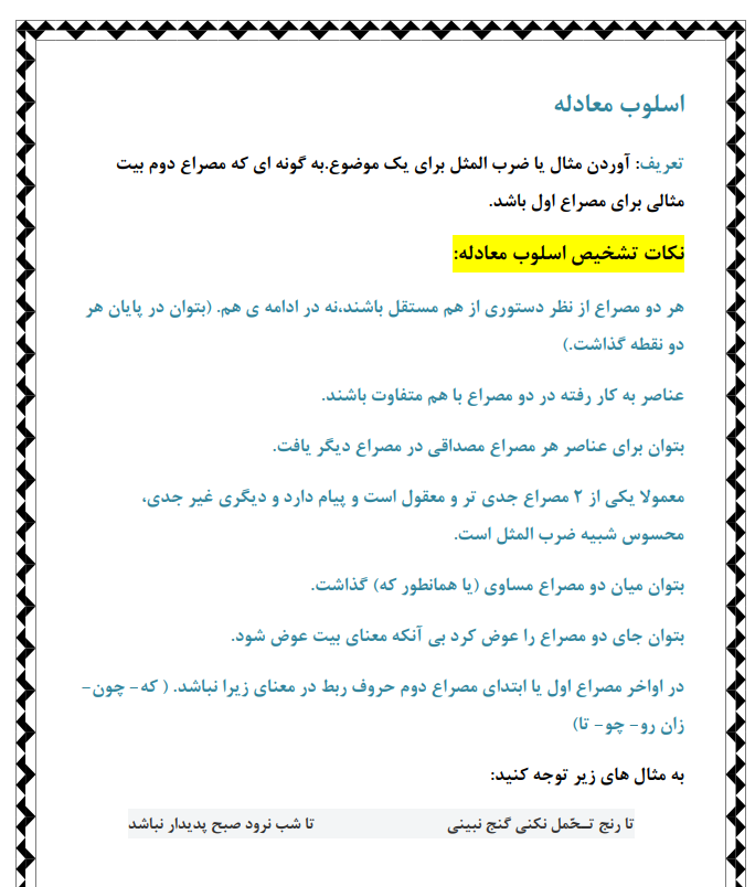 آرایهی اسلوب معادله یکی از مباحث مهم در درس ادبیات فارسی است که در آزمونها مورد توجه طراحان سوال است. این آرایه معمولا از آرایههایی است که دانش آموزان در تشخیص آن مشکل دارند، لذا دراین بخش توضیحات و مثالهایی از این آرایه آورده شده است.برای دیدن ادامهی مطلب فایل ضمیمه را دانلود کنید.