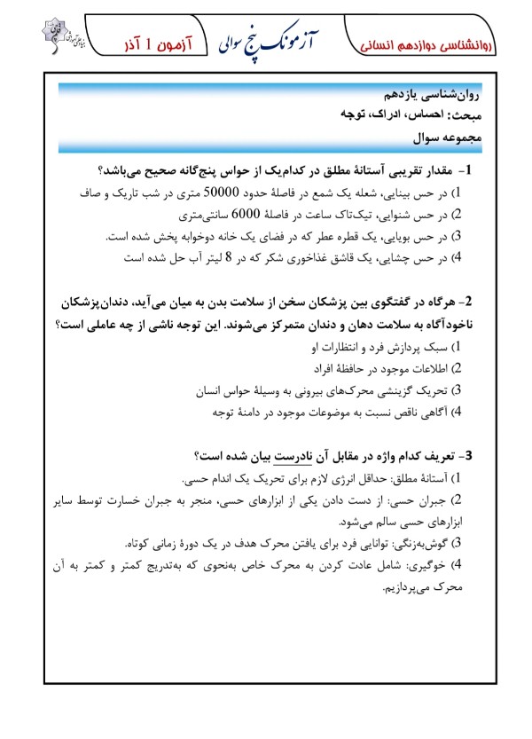 روانشناسی یازدهمفصل سوم: احساس، توجه، ادراکمتناسب با بودجه بندی آزمون پیش روفایل کامل سوالات و پاسخ نامه تشریحی را از قسمت فایل های ضمیمه دانلود کنید.