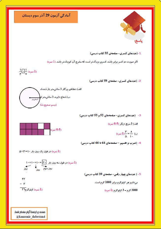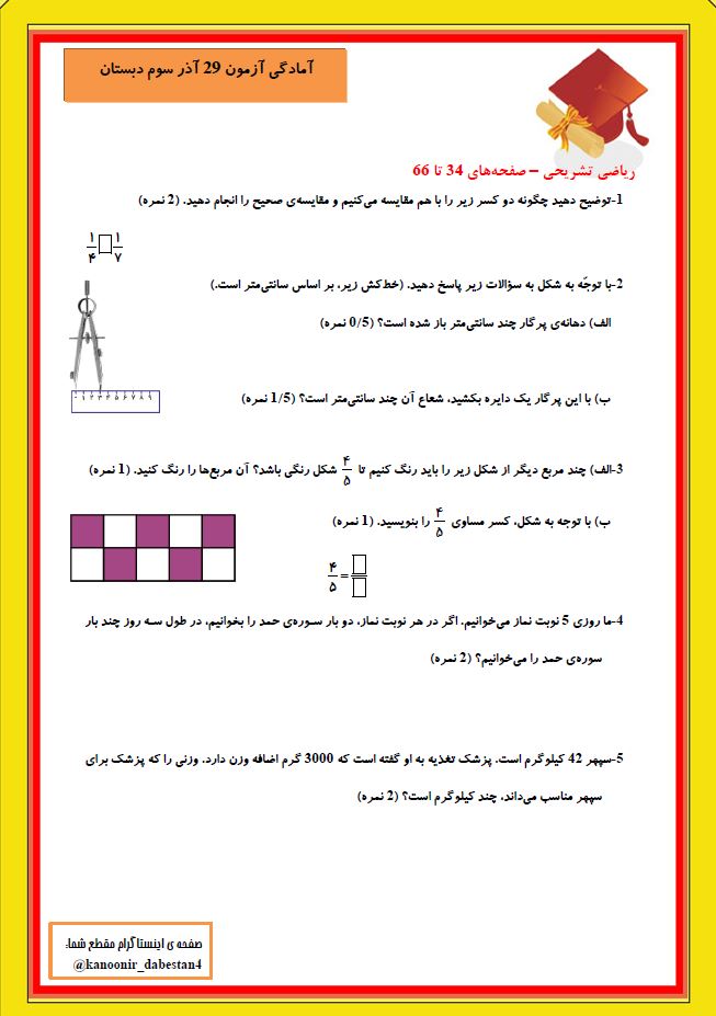 نمونه سوال تشریحی درس ریاضی آمادگی آزمون 29 آذر سوم دبستان صفحه های 34 تا 66+ پاسخ