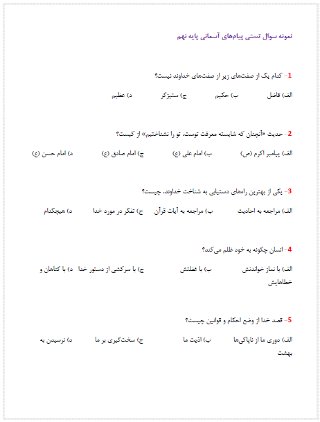 نمونه سوال تستی پیامهای آسمان مطابق با آزمون 15 آذر