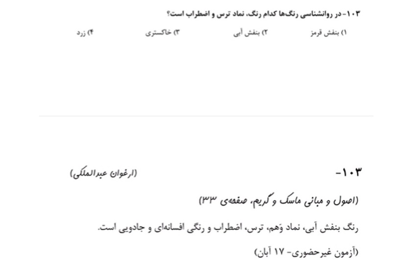 علت: در این سوال گزینه های 3 و 4 به راحتی قابل حذف است و چالش داوطلب برای پاسخ گویی گزینه های 1 و 2 می باشد. وجه اشتراک این دو گزینه ته رنگ بنفش می باشد و داوطلب باید بین ته رنگ آبی و قرمز دست به انتخاب بزند و به دلیل ویژگی های رنگ قرمز( پرهیجان، گاهی آزاردهند و محرک عصبانیت و...) در مقابل رنگ آبی ( آرامش، لطافت و..) این گزینه را انتخاب می کند.