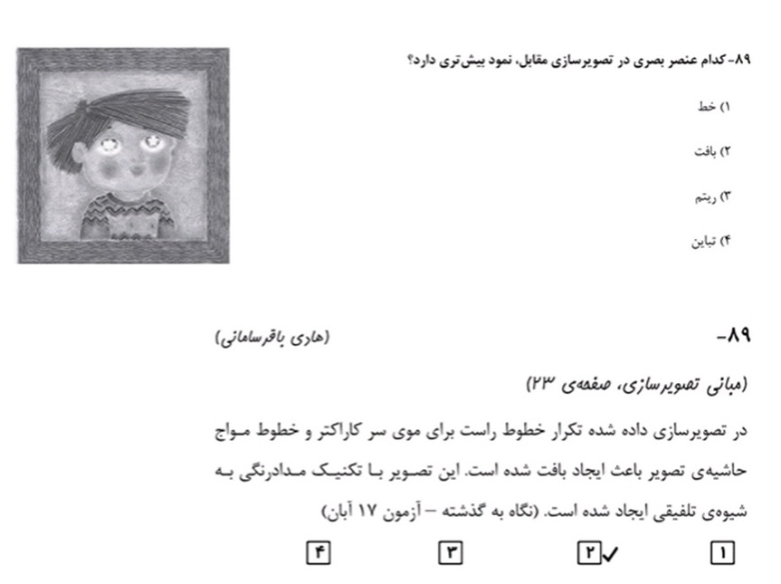 علت: در این سوال پرسش شده است: کدام عنصر بصری نمود بیشتری دارد. در وهله اول داوطلب باید بداند عناصر بصری شامل چه مواردی هستند.( خط، نقطه، سطح، رنگ، بافت، اندازه و تیرگی روشنی/ کتاب مبانی هنرهای تجسمی) اگر این مطلب اولیه را بداند گزینه های 3 و 4 قابل حذف می باشند و باید بین گزینه های 1 و 2 یکی را انتخاب کند.