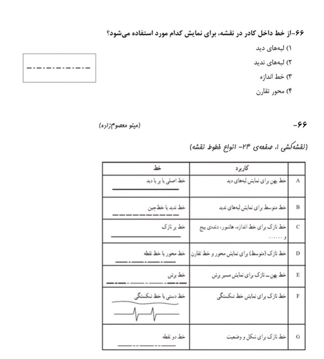 پیشنهاد: ترسیم این خط ها برای خود و مرور آن و نیز توجه به این خطوط در سوالات مختلف می تواند باعث یادگیری تفاوت های خطوط مختلف گردد. ( در جدول صفحه 24 کتاب نقشه کشی 1 انواع خطوط موجود می باشد.)