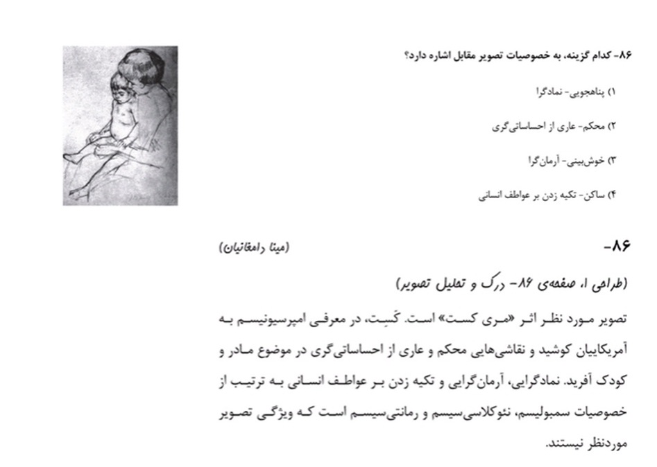 علت: تصویر مادری را می بینیم که فرزندش را در آغوش گرفته است. طبق پیش فرض های ذهنی هر جا تصویر مادر و فرزند دیده می شود، در درجه اول مفاهیم گزینه های 1 و 4( تکیه به عواطف انسانی، پناه جویی) به ذهن می رسد و داوطلب نیز بدون بررسی سبک اثر و خالق آن این گزینه ها را انتخاب می کند و در دام این سوال می افتد.