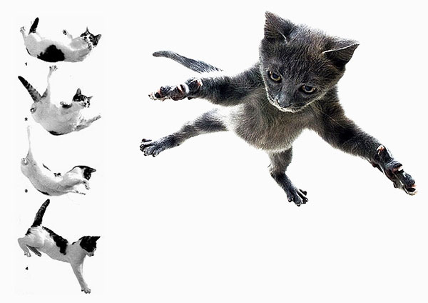 جالب است که بدانید گربه ها نیز تا قبل از رسیدن به سرعت حد و تا زمانی که شتاب را حس می کنند خود را جمع می کند اما وقتی حرکتشان بدون شتاب می شود با خیال راحت مثل یک سنجاب دست و پاهای خود را می کشد و بدن خود را شبیه چتر نجات پهن می کند و با این حرکت سرعت سقوط خود را کمتر می کند و با زاویه ای که به پاهای خود می دهد موقع برخورد با زمین نیرو را به مفاصل خود هدایت می کند و بدین صورت کمترین آسیب را می بینند.