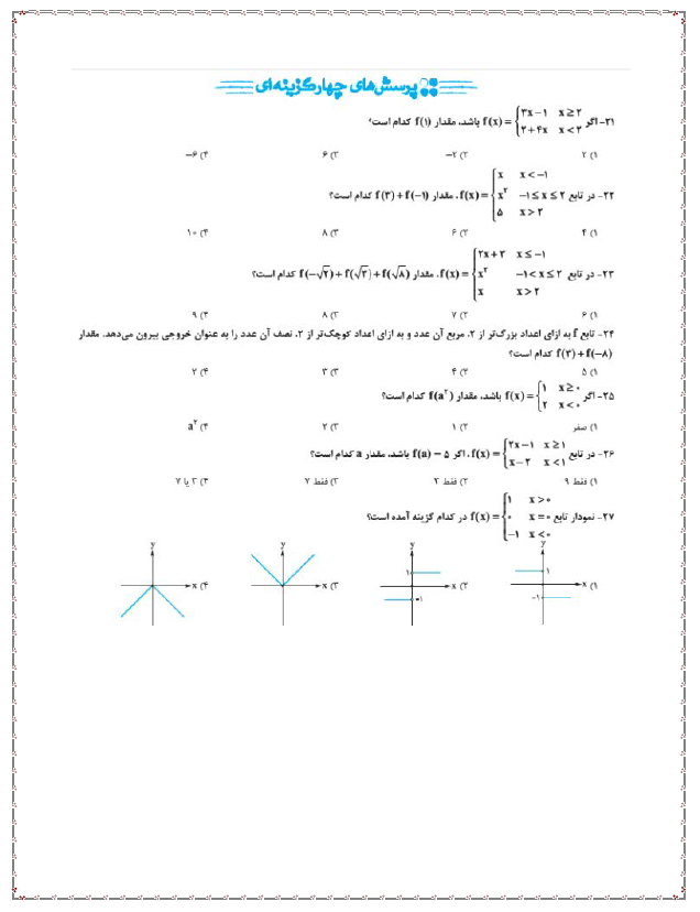 نمونه سوال تستی مبحث تابع چند ضابطه ای ریاضی یازدهم انسانی مطابق با آزمون 29 آذر