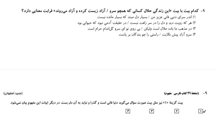 توضیح: از میان دانشآموزان، 28 درصد به سؤال جواب صحیح دادند اما 45 درصد به اشتباه گزینه 4 را انتخاب کردهاند. خیلی واضح است که بیشتر دانشآموزان از مفهوم بیت صورت سؤال غافل شدهاند و تنها به واژه «آزاد» که در صورت سؤال و گزینه 4 آمده توجه کردند و در دام سؤال که به عمد از سوی طراح، ذکر شده گرفتار شدند. مفهوم گزینه 4: «سرو آزاد که هیچ ثمری ندارد و آزاد و بلند است در مقابل معشوق که قد بلندی دارد مثل غلام و بنده است». در واقع بیت گزینه 4 یک بیت عاشقانه است و هیچ ارتباطی با آزادی و دلبسته نبودن به دنیا که اندیشه اصلی بیت صورت سؤال و گزینه 1 است ندارد. دانشآموزان باید دقت نمایند تا در سؤالات مفهوم و قرابت معنا در دام کلمات مشابه در صورت سؤال و یک گزینه گرفتار نشوند و به اندیشه و فکر حاکم بر بیت دقت نمایند و تا حد امکان مفهوم ابیات را در چند کلمه برای خود بگویند و درستترین گزینه را برای پاسخ انتخاب کنند.