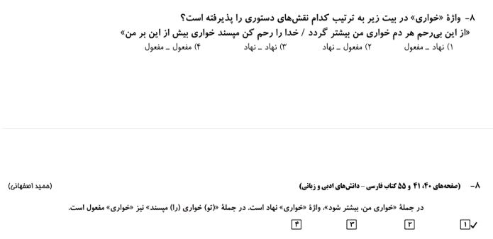 توضیح: از میان دانش آموزان، 41 درصد به درستی گزینه صحیح را انتخاب کردند؛ اما 30 درصد به سؤال اشتباه پاسخ دادهاند و گزینه 4 را انتخاب کردند. این گروه از افراد در تشخیص نقش کلمه «خواری» در مصرع اول اشتباه کردند. بهتر است در زمان تشخیص نقش مفعول، فعل جمله را پیدا کرده و از آن دو سؤال «چه چیز را» و «چه کس را» بپرسیم. در صورتی که پاسخی برای آنها نیافتیم باید بدانیم که فعل نیازی به مفعول ندارد و در اصطلاح دستوری «ناگذر» است. «گردد» در معنی «شود» فعل اسنادی است و نیازی به مفعول ندارد. بنابراین به راحتی میتوان تشخیص داد که «خواری من» نهاد جمله است. باید در نظر گرفت بهترین راه، زمان پاسخ دادن به سؤالات دستور زبان این است که شعر را به زبان امروزی برگردانیم تا جایگاه و نقش کلمات به خوبی برای ما مشخص شود.