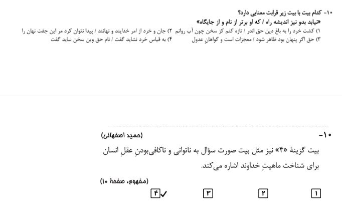 توضیح: از میان دانشآموزان 53 درصد به درستی پاسخ داده اند. اما 41 درصد گزینه 2 را انتخاب کرده اند. به نظر توجه دانش آموزان به کلمات جان و خرد در کنار خداوند در بیت گزینه 2 سبب شده تا آنها این پاسخ را انتخاب کنند. در سؤالات مفهوم نباید به یک کلمه توجه کرد بلکه باید مفهوم کلی بیت را در نظر گرفت. اگر نگاهی به بیت گزینه 2 بکنیم در صورتی که توانایی معنای آن را هم نداشته باشیم اما دریافت خواهیم کرد که در مصرع اول گفته «جان و خرد از امر خدا هستند» ولی جایی اشاره ای نشده این خرد توانایی درک خداوند را ندارد. اما در گزینه 4 به وضوح این مفهوم وجود دارد.