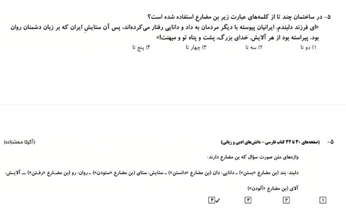 توضیح: از میان دانشآموزان 15 درصد به سوال صحیح پاسخ دادند و 37 درصد گزینه 1 و 30 درصد گزینه 2 را انتخاب کردند. به نظر عدم توجه به صورت سؤال سبب این اشتباه از سوی دانش آموزان شده. به نظر میرسد آنها از اینکه صورت سؤال از آنها خواسته کلمات دارای بن مضارع را بیابند غافل شده اند و بیشتر به سوی افعال توجه کرده اند و شاید به دنبال فعل مضارع دارای بن مضارع بوده اند. در صورتی که صورت سوال کلمات دارای بن را خواسته که این شامل همه کلمات میشود.