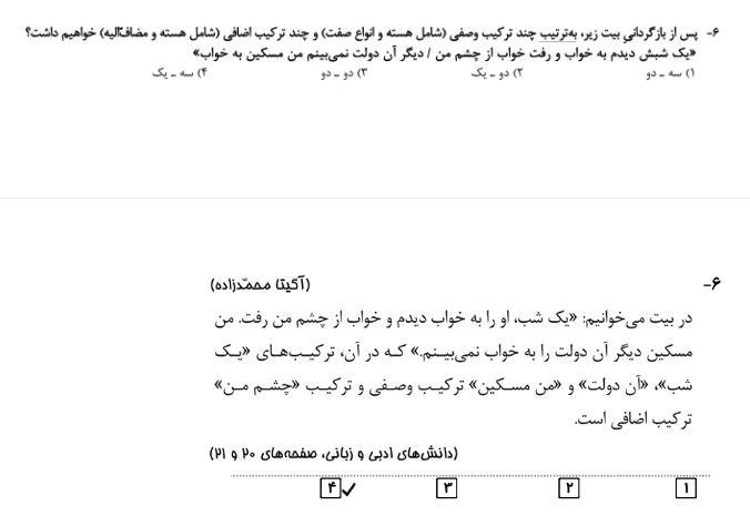 توضیح: از میان دانشآموزان 30 درصد به درستی گزینه 4 را انتخاب کردند. اما به همین میزان یعنی 30 درصد گزینه 2 و 30 درصد گزینه 3 را انتخاب کرده اند. درباره این سؤالات در اولین گام بهتر است بیت را به صورت نثر بازگردانی کنیم. و درباره ترکیبات وصفی به اعداد مثل «یک» در این بیت، به «آن» و «این» و یا «هر» دقت کنیم. این صفتها در صورتی که وابسته پیشین باشند و قبل از هسته بیایند ترکیب وصفی میسازند. به نظر عدم تسلط در برگردانی شعر به متن عادی و عدم توجه به «یک» و «آن» قبل از هسته سبب گرفتاری در این دام شده است.
