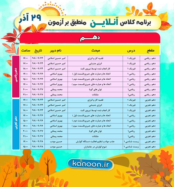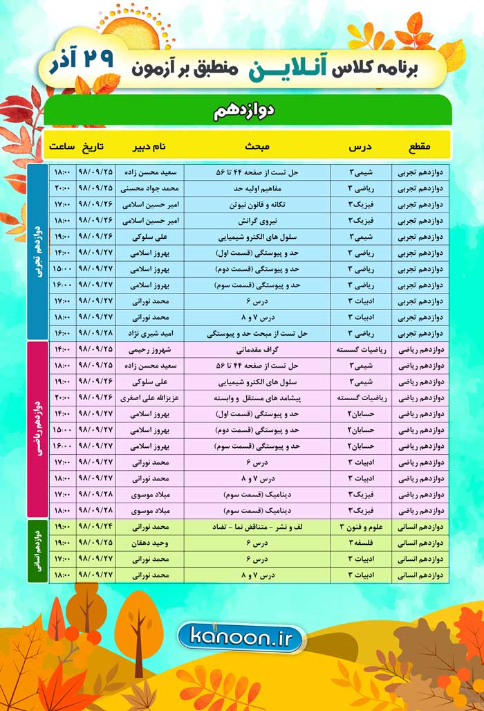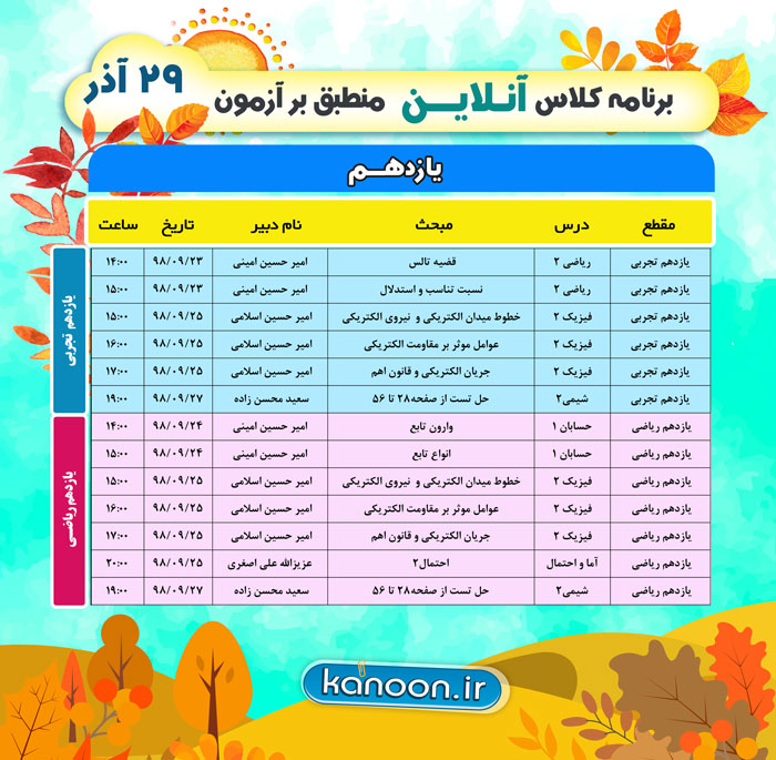 برنامه برگزاری کلاس های درسی آنلاین منطبق بر آزمون 29 آذر را در ادامه می توانید مشاهده نمایید:برای مشاهده برنامه کلاس های آنلاین کلیک کنید برای مشاهده باز پخش کلاس های آنلاین کلیک کنید