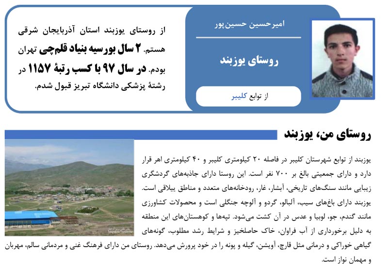 از روستای یوزبند استان آذربایجان شرقی هستم.2 سال بورسیه بنیاد قلم چی بودم.در سال 97 با کسب رتبه 1157 در رشته پزشکی دانشگاه تبریز قبول شدم.