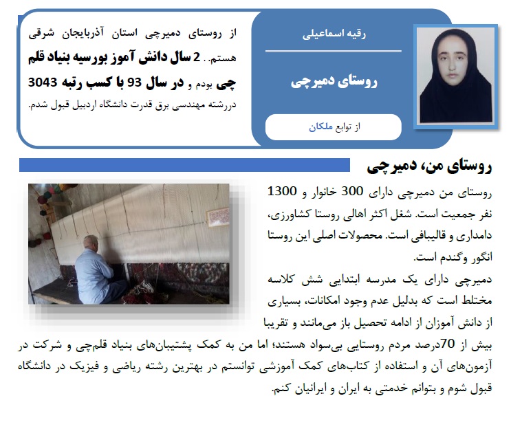 رقیه اسماعیلی : از روستای دمیرچی تا مهندسی برق قدرت اردبیل