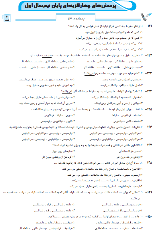 در این مطلب نمونه سؤال تستی فلسفه یازدهم توسط عاطفه شهنهاد دانشجوی حقوق دانشگاه تهران انتخاب شده است. جهت مشاهده به فایل ضمیمه مراجعه نمایید.