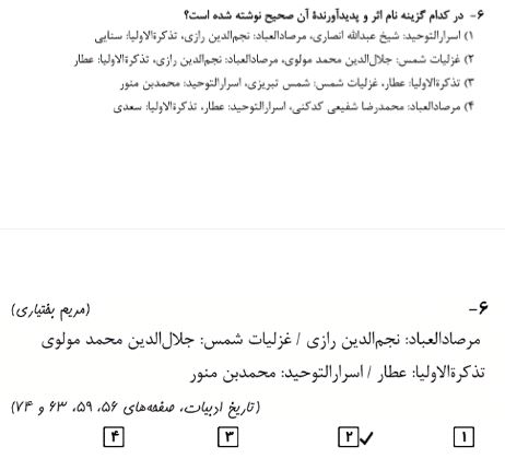 72 درصد به درستی گزینه 2 را انتخاب کردند؛ اما 26 درصد نیز به اشتباه گزینه 3 را انتخاب کردند. همواره در طول ادوار آزمونها یکی از دام های مهم تاریخ ادبیات مربوط به غزلیات شمس تبریزی است که از آثار مولوی(جلال الدین محمد بلخی) است نه شمس! دانش آموزان به این کتاب باید دقت ویژه نمایند.