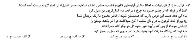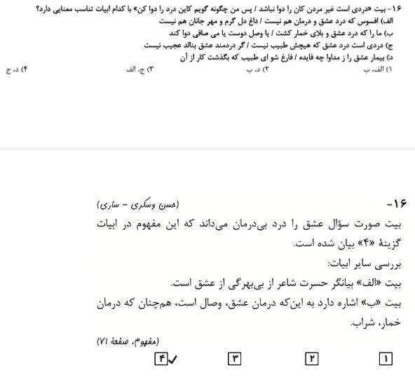 47 درصد از دانش آموزان به درستی گزینه 4 را انتخاب کردند و به همین میزان نیز گزینه 3 را انتخاب کردند. در این سوال درباره مفهوم بیت «ج» و مشابهت بالای آن با صورت سؤال شکی وجود ندارد. آنچه احتمالاً سبب به دام افتادن دانش آموزان شده مفهوم بیت «الف» است. در این بیت که به صورت تعمدی از سوی طراح انتخاب شده در مصرع اول گفته «درد عشق و درمانی برای بی عشقی هم در من وجود ندارد». درباره درمان ناپذیری غم عشق حرفی زده نشده. در صورتی که در گزینه «د» به وضوح درد عشق و بیمار غم عشق را بیماری لاعلاج دانسته که درمان ناپذیر است. در این سؤال نیز عدم توجه به مفهوم شعر سبب به وجود آمدن این غلط شده است. پیشنهاد میشود در این باره همه ابیات خوانده شود و به یک بیت اکتفا نشود و در ضمن به غیر از مصرع اول هر بیت، مصرع دوم آن نیز خوانده شود. محور افقی اشعار و مفهوم یک بیت در هر دو مصرع، خود نوعی راهنما برای معنا کردن بیت است. دانش آموز نباید در سؤال های قرابت و مفهوم فقط به کلمات بسنده کند. باید بیت را به صورت ساده برای خود معنا کند و مفهوم کلی آن را دریافت کند.