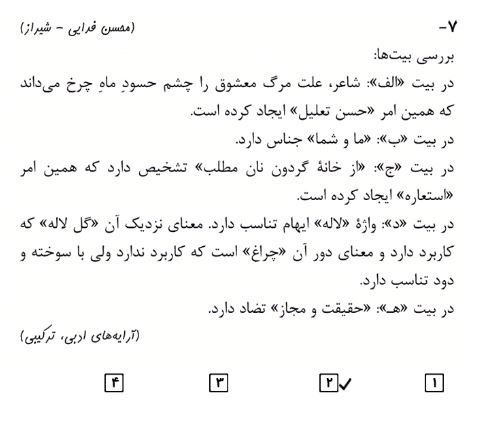 تنها 26 درصد از دانش آموزان گزینه 2 را انتخاب کردند و 31 درصد گزینه 3 و 31 درصد گزینه 4 را انتخاب کرده اند. در این سؤالات همیشه بهتر است از آرایه ای شروع کنیم که به آن تسلط داریم و سعی کنیم از راه رد گزینه به سؤال پاسخ دهیم و درگیر همه ابیات و گزینه ها نشویم. راه دیگر آن است که آرایه ای را برای شروع انتخاب کنیم که در ابیات زیادی تکرار نشده است. چون اگر با استعاره یا کنایه کار را شروع کنیم ممکن است ابیات زیادی دارای این آرایه باشند ولی آرایه حسن تعلیل یا تناقص آرایه کمیاب تری است. اگر به راه اول یعنی آرایه آسانتر برویم شاید بتوان گفت تضاد از آسانترین آرایههاست. تضاد آرایه سوم است، پس به دنبال مورد سوم در گزینه ها میرویم. از همین طریق به راحتی گزینه 1 و 3 حذف میشوند چون آرایه تضاد در بیت «ج» وجود ندارد. اگر به آرایه کمیاب تر هم مراجعه کنیم باز هم این دو گزینه به راحتی حذف میشود. «حسن تعلیل» به عنوان آرایه ای که در ابیات زیادی موجود نیست در مورد «ه» نیز وجود ندارد. در بین گزینه های 2 و 4 نیز اگر به دنبال آرایه آسان دیگری چون جناس برویم به وضوح مشخص است در گزینه 4 آرایة جناس وجود ندارد. «که» در هر دو مصرع حرف است. به نظر روش پاسخ دهی غلط به این سؤال از سوی دانش آموزان سبب گرفتار شدن در دام این سؤال شده است.