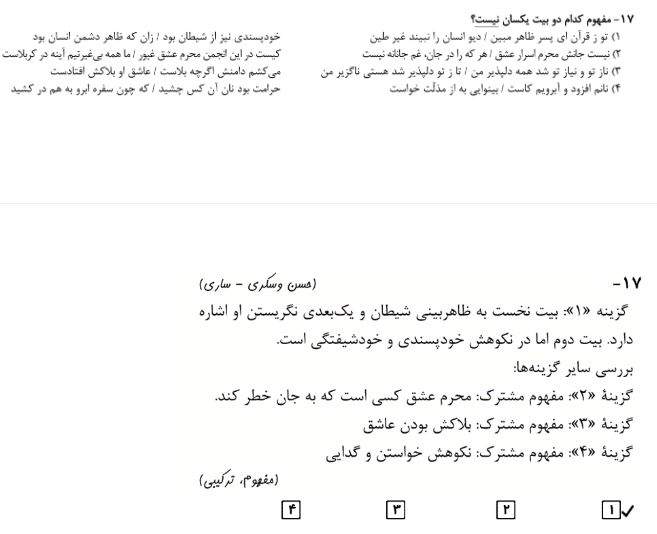 از میان دانش آموزان 24 درصد به درستی گزینه 1 را انتخاب کردند و 35 درصد از آنان گزینه 2 را به عنوان گزینه صحیح به اشتباه انتخاب کردند. به نظر این گروه از دانش آموزان، به جای اینکه مفهوم هر بیت را برای خود آسان کنند به کلمات تکرار شده در بیت توجه داشتند. در سؤالاتی از این دست بایستی در گام اول هر بیت را خواند و مفهوم کلی آن را در نظر گرفت نه به واسطه تکرار کلمات گزینه ای را برگزید یا رد کرد. در گزینه 1 هم توجه به دو واژه «ظاهر» سبب شده است دانش آموز به گزینه بعد مراجعه کند. در صورتی که با خواندن همان گزینه 1 می شود متوجه عدم تطابق معانی شد. اما در گزینه 2، مصرع دوم بیت دوم از بیدل دهلوی، مفهوم کمی پیچیده دارد و احتمالاً به همین دلیل این گزینه از سوی دانش آموزان انتخاب شده و مفهوم در خطر افتادن از سر عشق از آن دریافت نشده. در ضمن به صورت سؤال نیز باید دقت کرد.