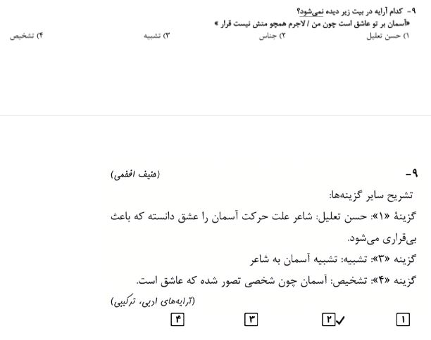 62 درصد از دانش آموزان به خوبی به سؤال پاسخ دادند و گزینه 2 را انتخاب کردند؛ اما 30 درصد از دانش آموزان به غلط گزینه 1 را انتخاب کردند. این درصد از دانش آموزان احتمالاً عدم تسلط بر آرایه حسن تعلیل و جناس داشتند. این افراد احتمالاً بین من و منش جناس دیده اند. کلمه «منش» در اصل من + ش به عنوان ضمیر متصل است و بخشی از کلمه نیست که بتوان آن را با من جناس دانست. در ضمن اگر دانش آموزان به یاد داشته باشند در صفحات 65 و 66 کتاب فارسی دهم، درباره حسن تعلیل آموخته بودند که اگر شاعری دلیلی غیر واقعی در بیت بیاورد خالق آرایه حسن تعلیل خواهد بود. علت حرکت آسمان را عشق دانسته و این دلیل در عالم واقع اتفاق نمی افتد پس بیت حسن تعلیل دارد و این آرایه جناس است که بیت آن را ندارد.