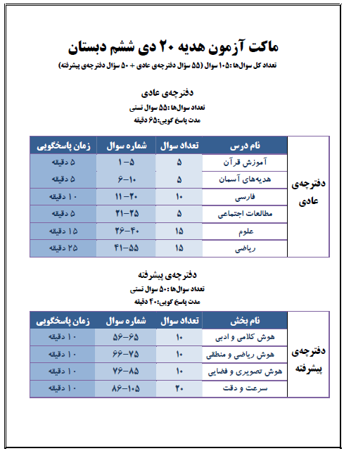 4) پاسخگویی به هر یک از دفترچههای پیشرفت درسی (عادی) و دفترچهی پیشرفته (آمادگی برای آزمون تیزهوشان) اختیاری است. ضمن اینکه میتوانید به سؤالات هر دو دفترچه نیز پاسخ دهید.