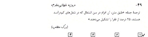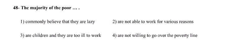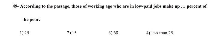 دانشآموزان سریع به عدد نوشته شده در داخل متن (15) رجوع کردهاند بدون توجه به معنی آن در حالی که در ادامه در متن گفته شده "یک چهارم دیگر (که منظور افراد فقیر است) کار میکنند ولی به اندازه کافی پول در نمیاورند که منظور سؤال دقیقا همین جمله است. توجه کنید که یک چهارم از %100، 25% میشود.