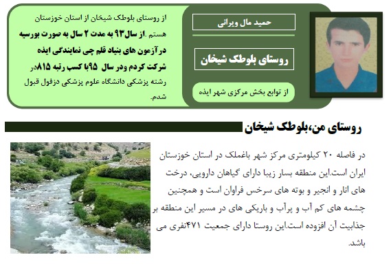 از روستای بلوطک شیخان از استان خوزستان هستم .از سال ۹۳ به مدت ۲ سال به صورت بورسیه درآزمون های بنیاد قلم چی نمایندگی ایذه شرکت کردم ودر سال ۹۵ با کسب رتبه ۸۱۵ در رشته پزشکی دانشگاه علوم پزشکی دزفول قبول شدم