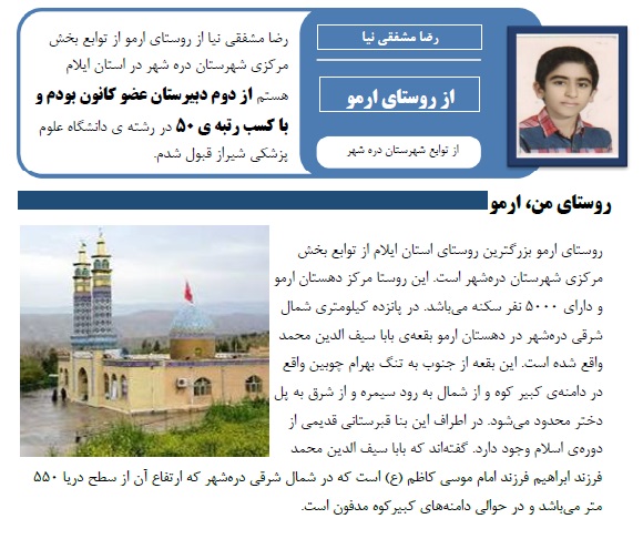 رضا مشفقی نیا از روستای ارمو از توابع بخش مرکزی شهرستان دره شهر در استان ایلام هستم از دوم دبیرستان عضو کانون بودم و با کسب رتبه ی 50 در رشته ی دانشگاه علوم پزشکی شیراز قبول شدم.